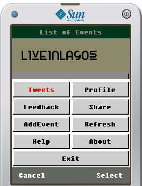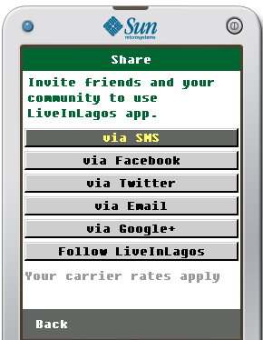 - To share and inform your friends and community of the LiveInLagos app, click on the SHARE menu to share via SMS, Facebook, Twitter or Email.